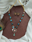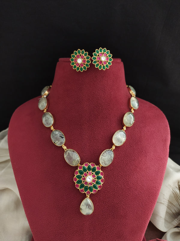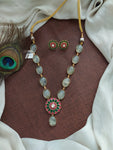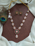 Semi-precious gemstone Necklace with Matching Round Studs – Available in Mint, Pink, and Blue Color Options This Kundan Necklace Set is a true work of art, combining the allure of semi-precious...