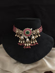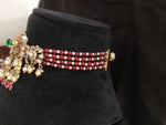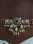 A graceful moissanite choker set, crafted with sparkling moissanite stones and rich ruby beads for a regal look. Designed in Victorian finish, this choker comes with matching earrings, making it perfect for bridal wear, festive occasions, or evening receptions.