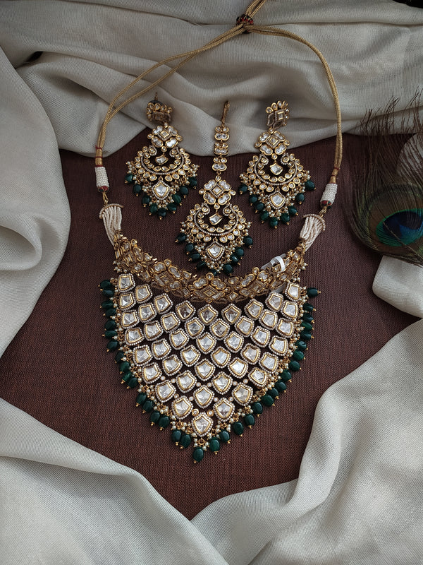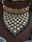 A grand Polki Kundan emerald bridal choker set in Victorian finish, crafted with white and green Polki Kundan stones. Accented with pearls and oval green beads for a regal touch....