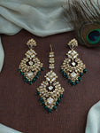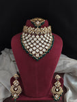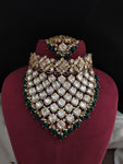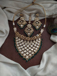 A grand Polki Kundan emerald bridal choker set in Victorian finish, crafted with white and green Polki Kundan stones. Accented with pearls and oval green beads for a regal touch. Comes with matching earrings and tikka — a perfect choice for weddings, receptions, and bridal occasions.