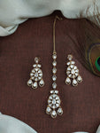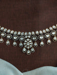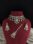 An elegant Polki Kundan choker set in a timeless white design, finished in Victorian style. This premium set comes with matching earrings and a tikka, making it a perfect choice...