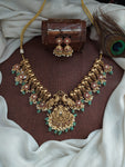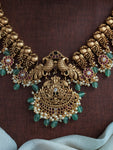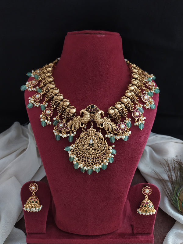 A timeless blend of tradition and elegance, this Antique Nakshi Work Peacock Necklace Set is designed for those who prefer a regal look without goddess motifs. The necklace is intricately...