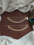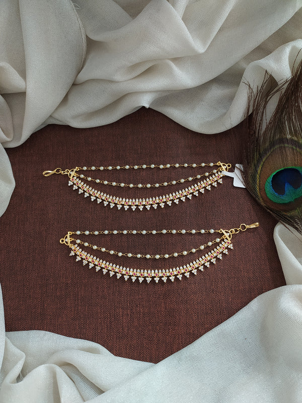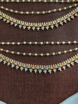 This gold-plated Zircon maathil is adorned with shimmering Zircon stones and delicate pearl strands, adding a regal charm to your traditional ensemble. A perfect accessory for weddings, festive occasions, and bridal...