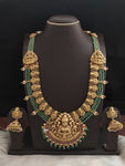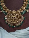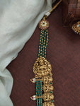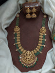 A majestic Antique Lakshmi Long Haram Set, intricately crafted with Nakshi work and featuring a full Lakshmi motif design in one layer, symbolizing prosperity and divine grace. The haram is further...
