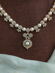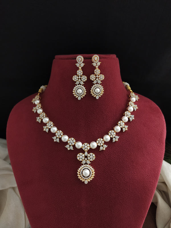 An exquisite short necklace set crafted with embedded pearls and dazzling Zircon stones, offering a perfect balance of elegance and sophistication. Available in two premium finishes, making it an ideal...