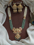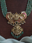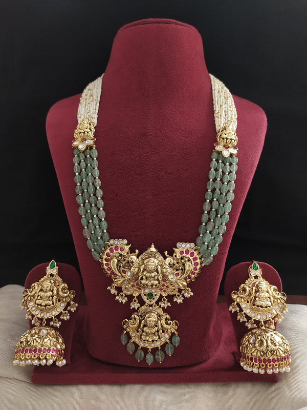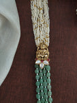 A stunning bridal fusion Kundan Mala Set featuring a divine Lakshmi pendant in antique gold finish, beautifully adorned with sparkling Moissanite and Jadau Kundan stones. The four-layered mala is strung...