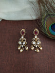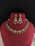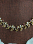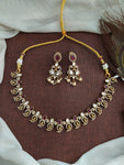 A sleek and elegant traditional mango design necklace set, crafted with ruby stones and Lakshmi motifs inside each mango. Enhanced with polki kundan stones for a rich, timeless appeal. Perfect...