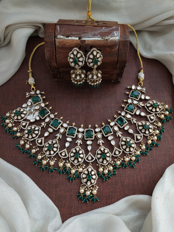 A timeless Victorian finish necklace set crafted with moissanite stones for a dazzling diamond-like look. Perfect for receptions, engagements, and festive occasions. Comes with matching earrings for a complete statement look.