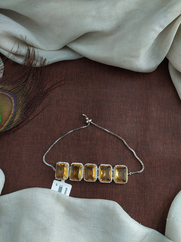 Elegant zircon stones adjustable bracelet featuring big AD stones in Green, Violet, Blue, and Yellow. The Blue variant comes in diamond finish, while the rest are crafted in premium rhodium...