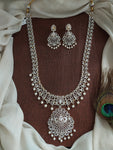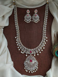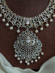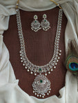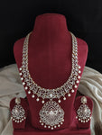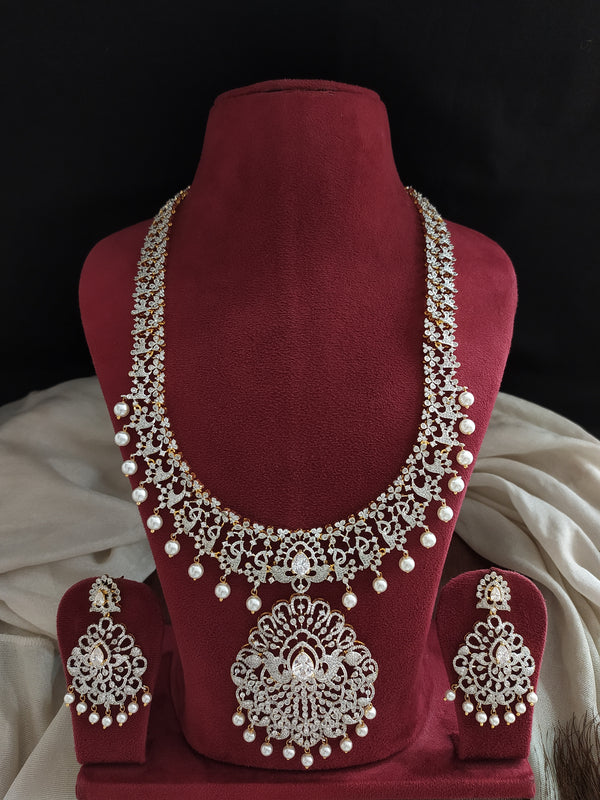 A stunning zircon long haram set in rich gold diamond finish, crafted with sparkling CZ stones for a luxurious real diamond-like appearance. Perfect for weddings, bridal wear, receptions, or any...