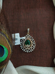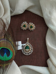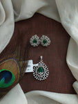 A striking statement diamond look-alike pendant set crafted with full white CZ zircon stones, highlighted by a rich emerald green center stone in both the pendant and earrings. Designed to...